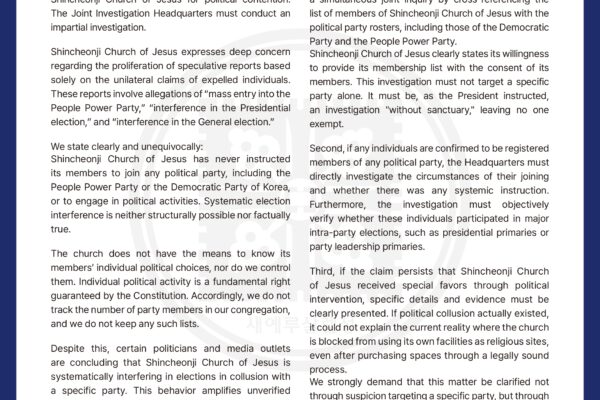 Seoul Shincheonji Church of Jesus has publicly called on authorities to conduct a fair and comprehensive investigation into allegations of political interference, rejecting claims that the church orchestrated mass political party enrollment or election manipulation. The call comes amid growing political debate and media scrutiny surrounding alleged ties between religious organizations and party politics. Some…